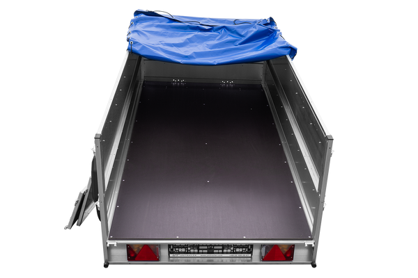 GARDEN TRAILER 264/2 KIPP remorque à deux essieux avec roue jockey, tiges de support, ridelles supplémentaires et bâche plate bleue