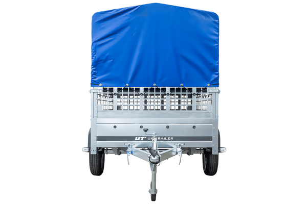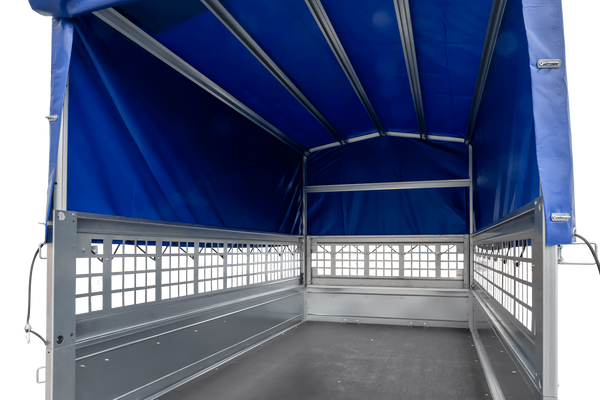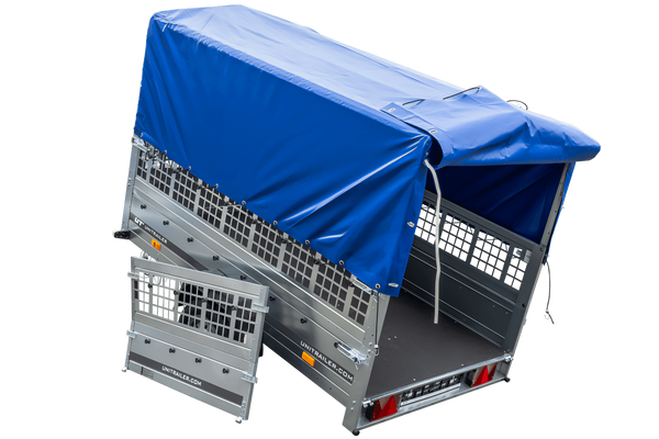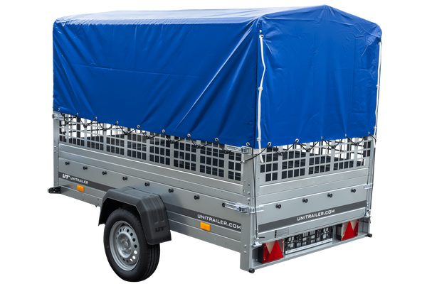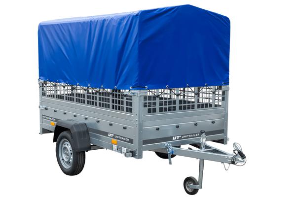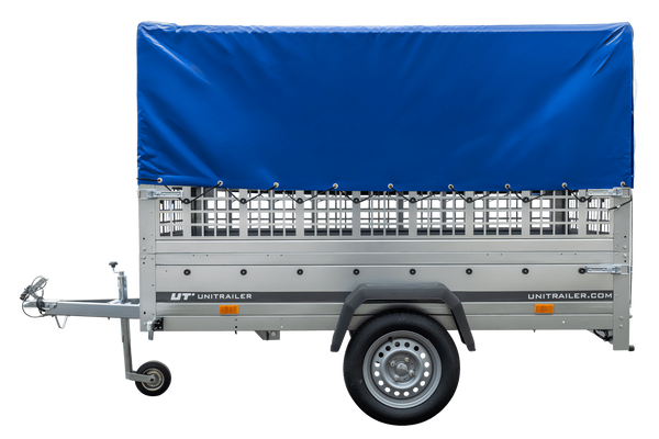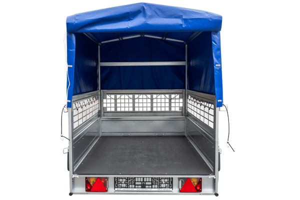 - Remorque bâchée d'occasion Garden Trailer 230 KIPP avec rehausses grillagées, bâche haute bleue et roue jockey. Modèle avec timon pliable très pratique - à usage multiple. PTAC de 300 à 750 kg.